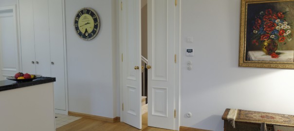 Für dieses Einfamilienhaus wurden moderne Kassettentüren gewählt, welche mit der gewünschten Inneneinrichtung optimal harmonieren. Türblatt und Zarge sind flächenbündig angeordnet und die verdeckt liegenden Bänder verstärken den modernen Charakter. Glas und Füllungsleisten sind dementsprechend eckig gehalten.
