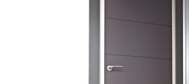 Eine Zarge aus gebürstetem Aluminium verleiht diesen außergewöhnlichen Innentüren ihre besondere Optik. Die schmalen Zargen wirken wie moderne Bilderrahmen um die schlichten Türblätter. Die raumhohe Ausführung und die passenden Beschläge runden das Gesamtbild ansprechend ab.