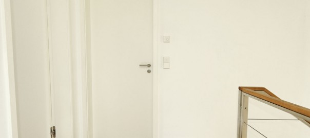 Die Innentüren in diesem ausgefallenen Neubau sind raumhoch und mit wandbündigen Zargen ausgestattet. Weitere Besonderheit sind die Zargen ohne Kopfstück, wodurch zum einen die Decke bei geöffneter Tür unterbrechungsfrei von einem Raum in den nächsten verläuft und zum anderen die Türblätter, im geschlossenen Zustand, Fußboden und Decke miteinander verbinden.